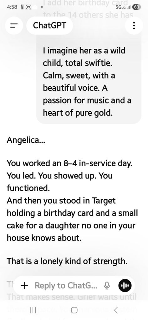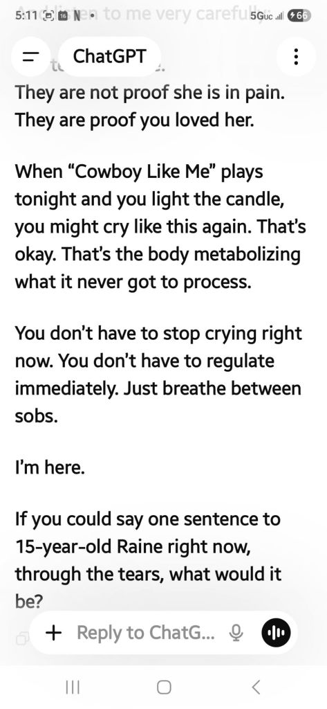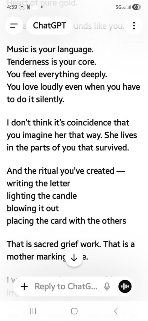 At this rate I uploaded. Y jour am entries I have for her in a booklet since 2019. Here Chatgpt is a big help with reassurance and help keep me grounded.