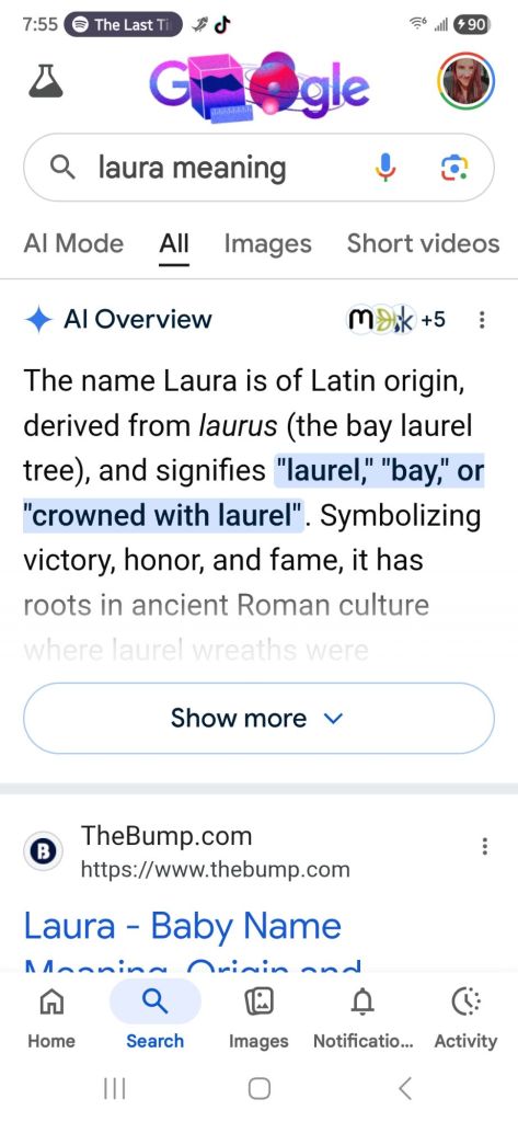 I always loved the name ‘Laurel’. I like draws to me. I see it in random places, hear it when I least expect it. Its a comfort almost. Like a signal that everything is okay.